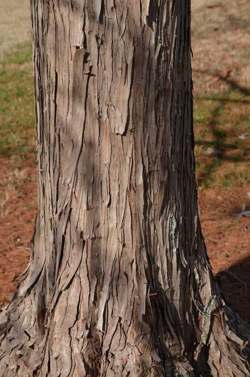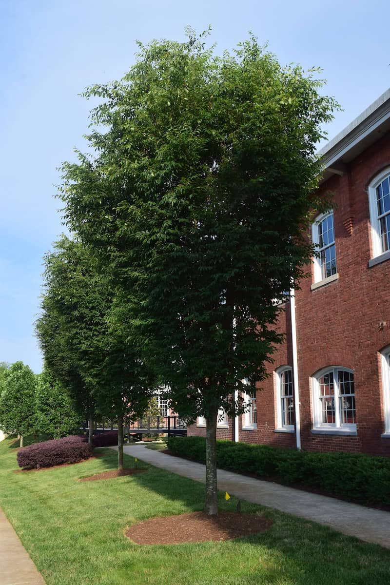Taxodium distichum Shawnee Brave® (‘Mickleson’) raised the bar for upright trees to emulate. Discovered and introduced by the late Earl Cully, Jacksonville, IL, who championed improved native tree species years before they became the norm. Although introduced over 60 years ago, it is still recognized as the gold standard of fastigiate-pyramidal trees. Sage green summer foliage becomes rusty orange in fall. The beautiful gray to reddish brown bark sloughs in strips and slivers, providing year-round beauty. The species is adaptable to wet as well as drier soils and hardy from zone 5 to10. 50-75’ high and 15-20’ wide. At Milliken Research, Spartanburg, SC, an allée was planted in early 2000. Trees are now 50’ high with no sign of slowing. (16., 17., and 18. Photos below)